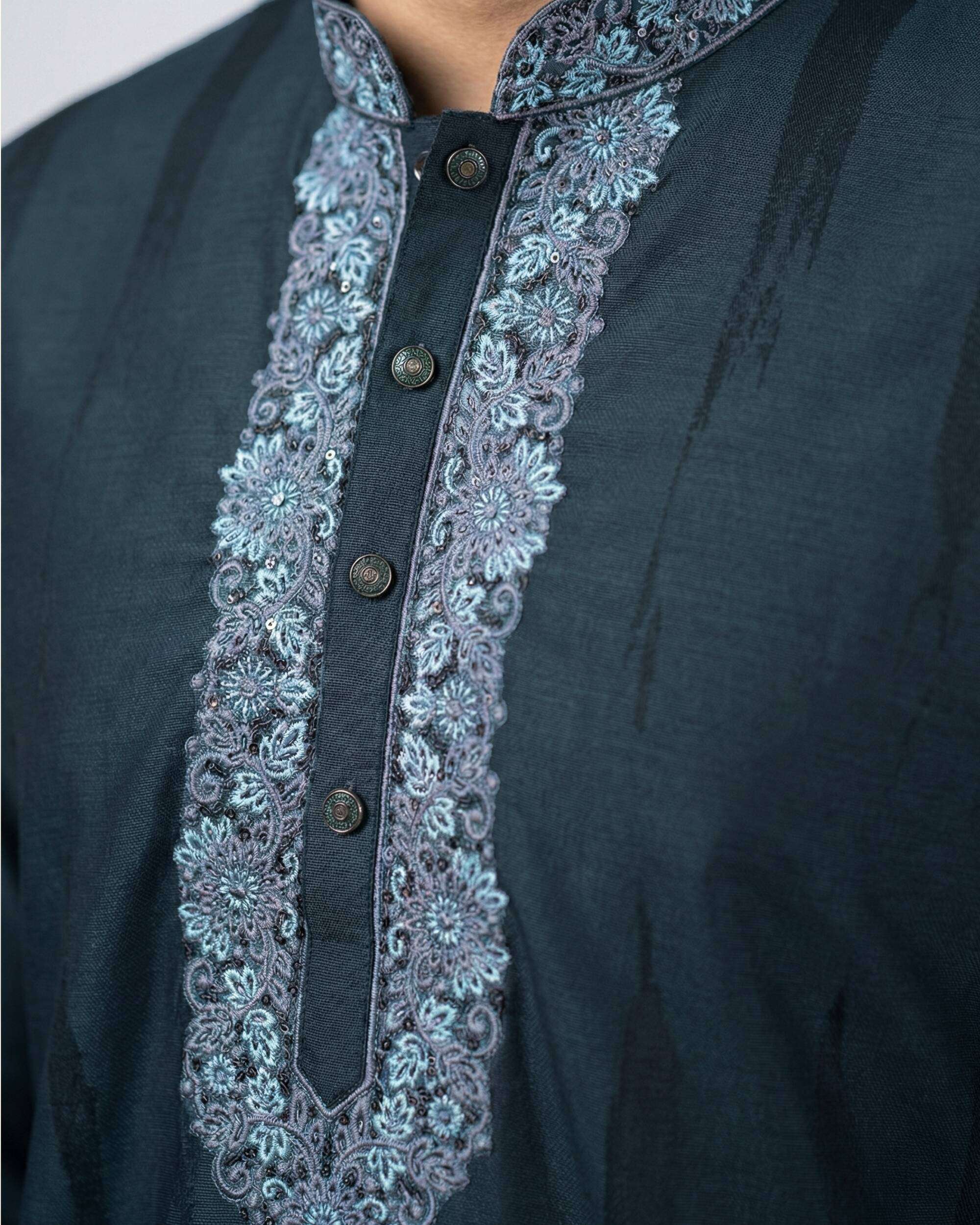 Made from high-quality imported cotton, the fabric feels soft, lightweight, and breathable — ensuring all-day comfort during Eid, weddings, cultural programs, and special gatherings. The decorative embroidered placket and subtle artistic prints enhance its premium appeal, while the tailored regular fit ensures a smart silhouette.