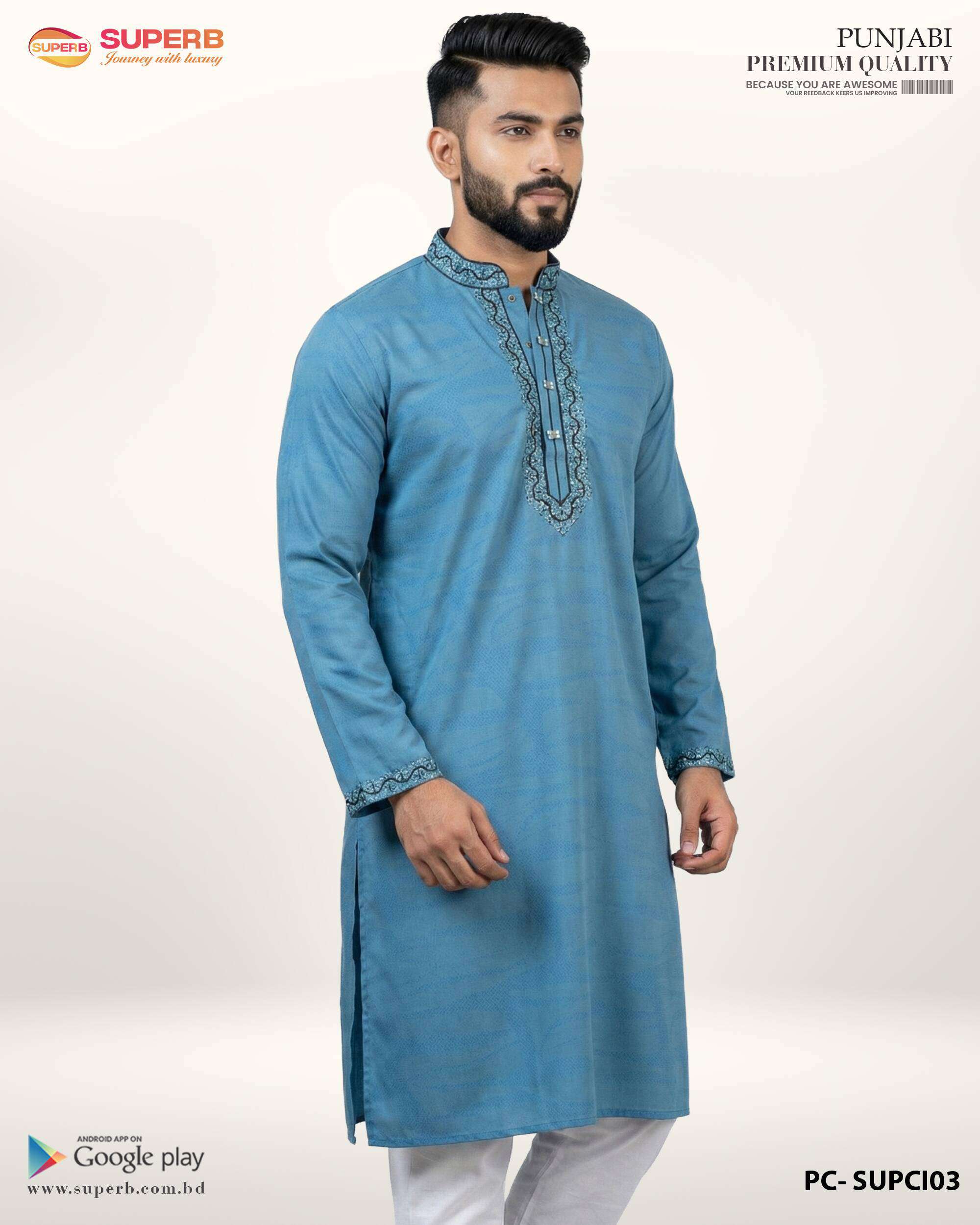 Upgrade your ethnic wardrobe with our China Imported Premium Cotton Panjabi. This stunning petrol panjabi is crafted for men who appreciate refined detailing and modern elegance blended with tradition.