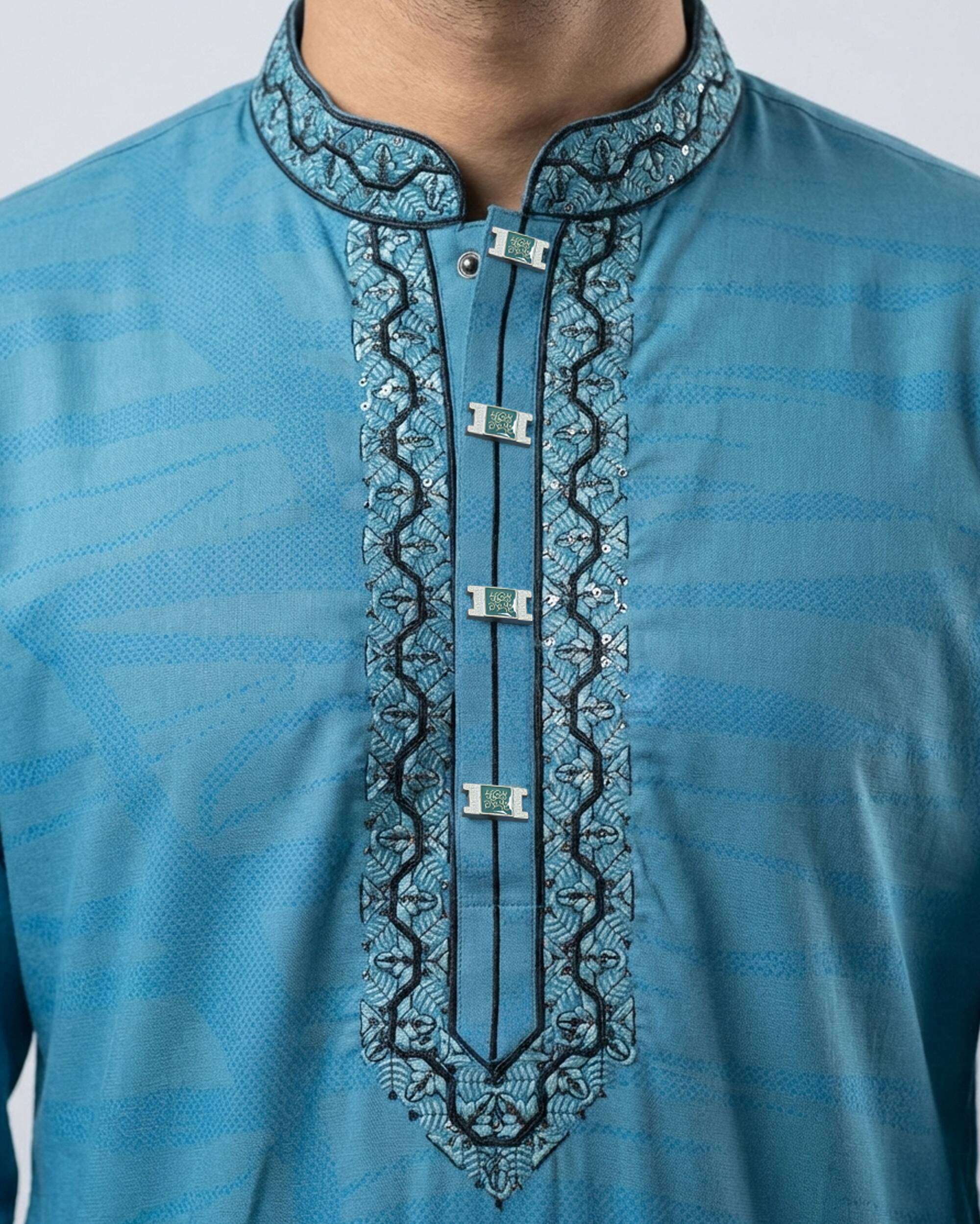 Short Description: Make a bold festive statement with this China Imported Premium Cotton Panjabi in Petrol. Designed with elegant embroidery work and breathable cotton fabric, it offers premium comfort with a sophisticated traditional look.