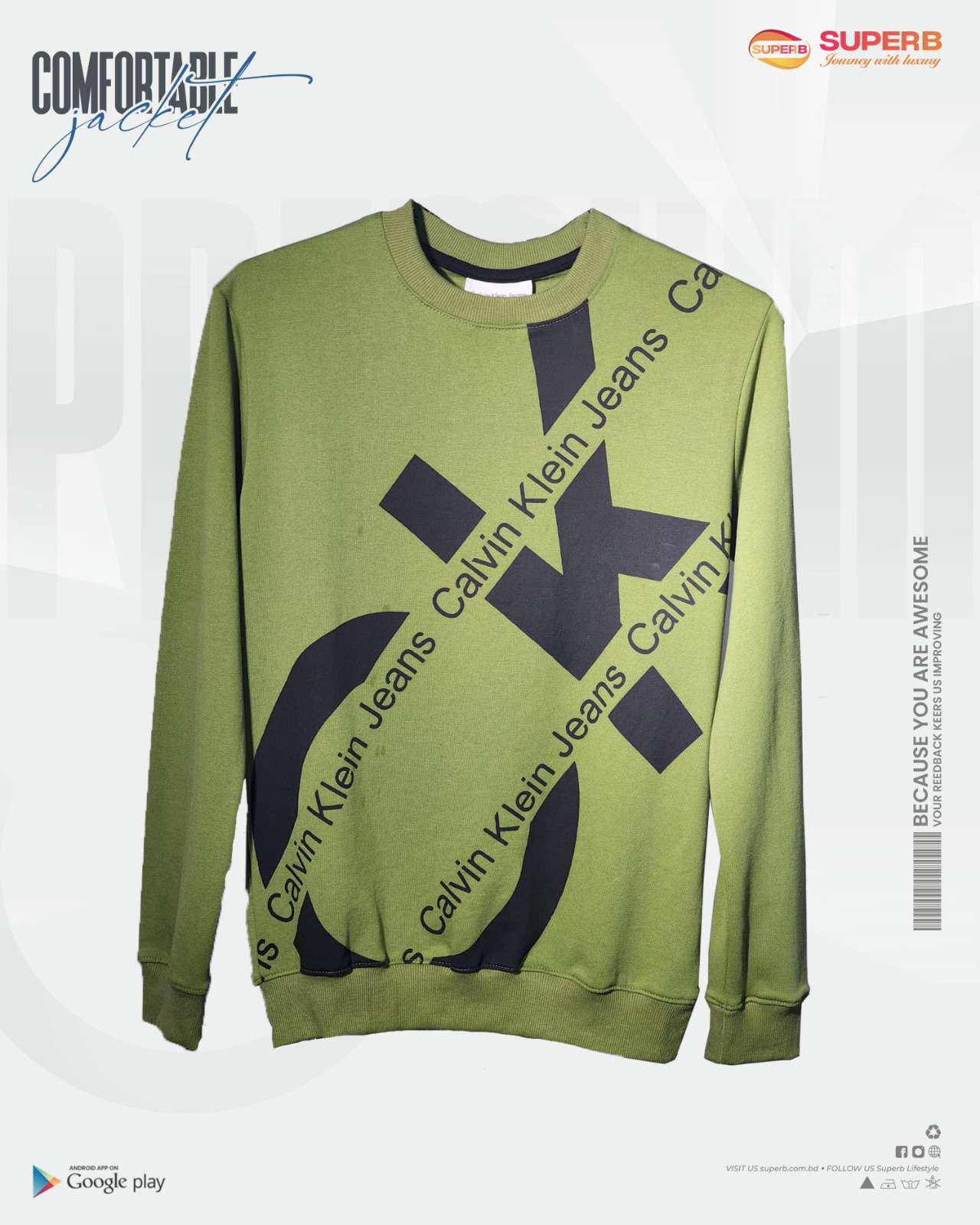 Short Description: Premium quality crew neck sweatshirt from CK Jeans in an olive green color featuring a large, stylized "CK" logo and brand name graphic.