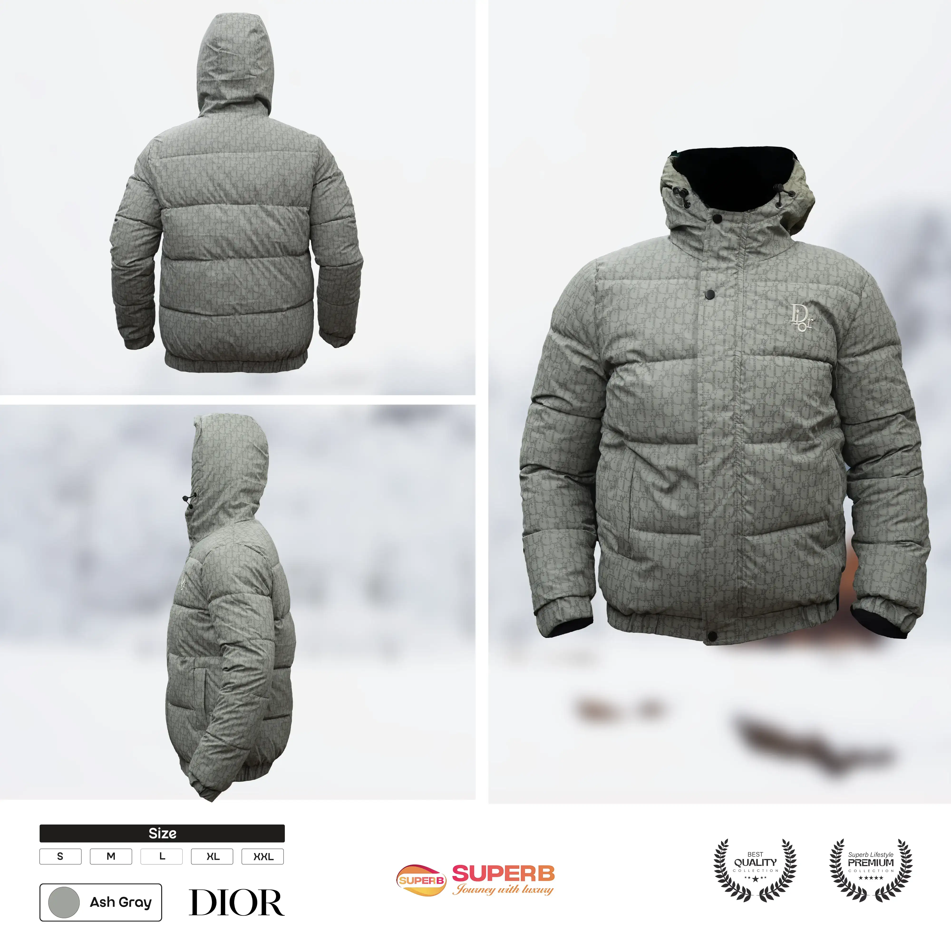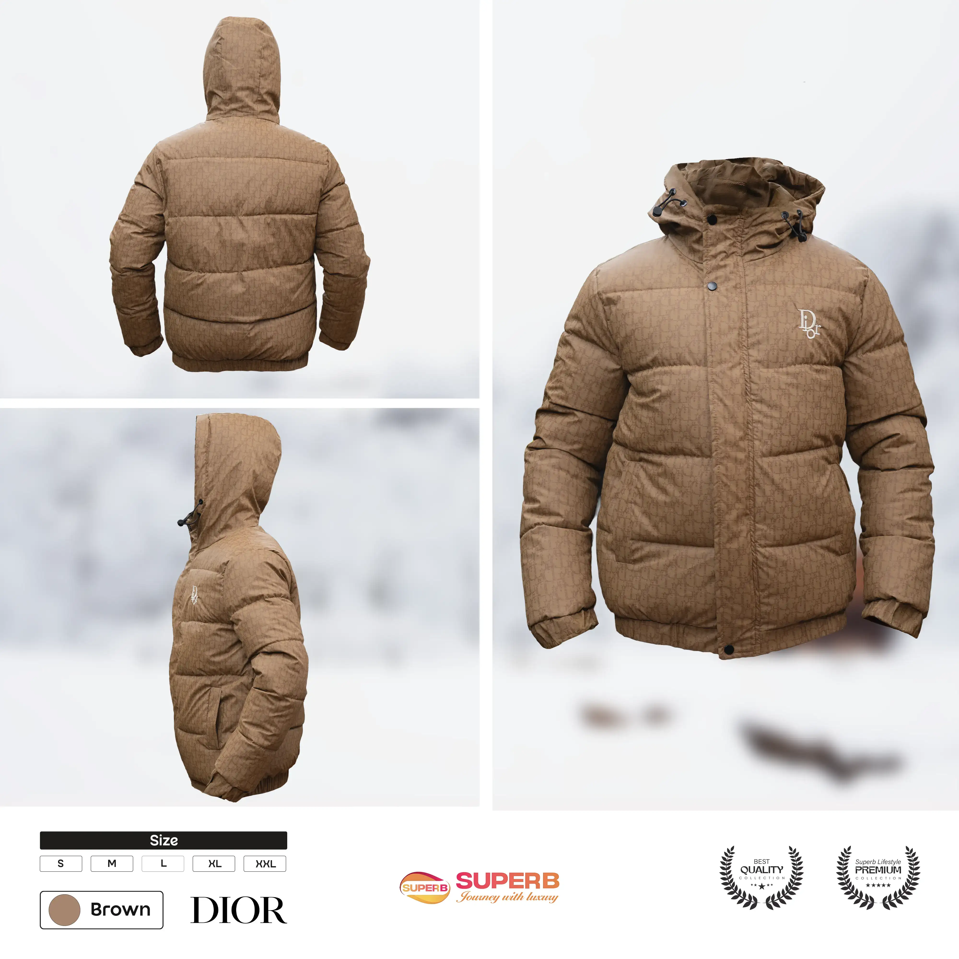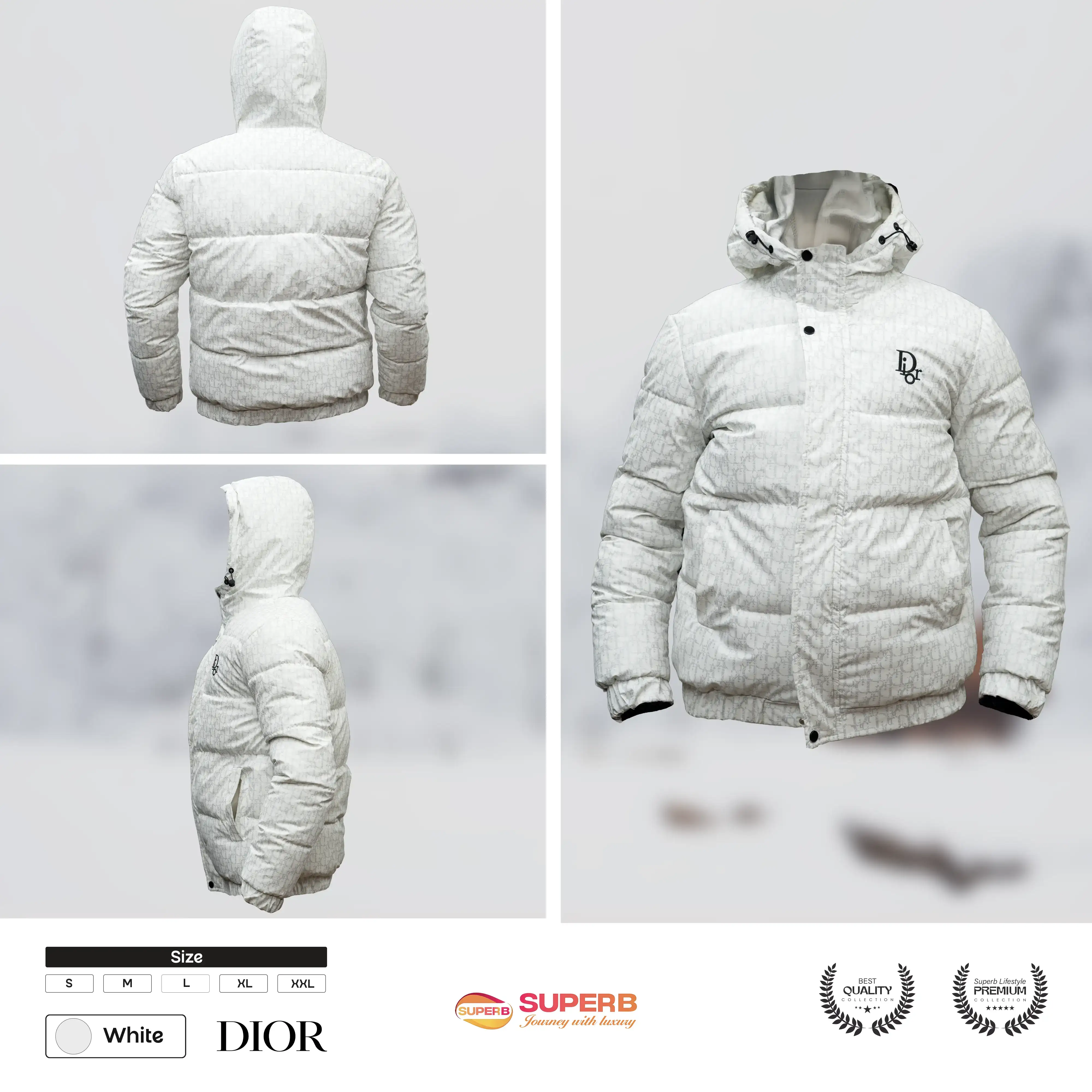 Short Description: Stay warm in style with the Dior Down Jacket featuring the iconic Oblique pattern, hood, and zip closure. Available in white, gray, black, and brown.