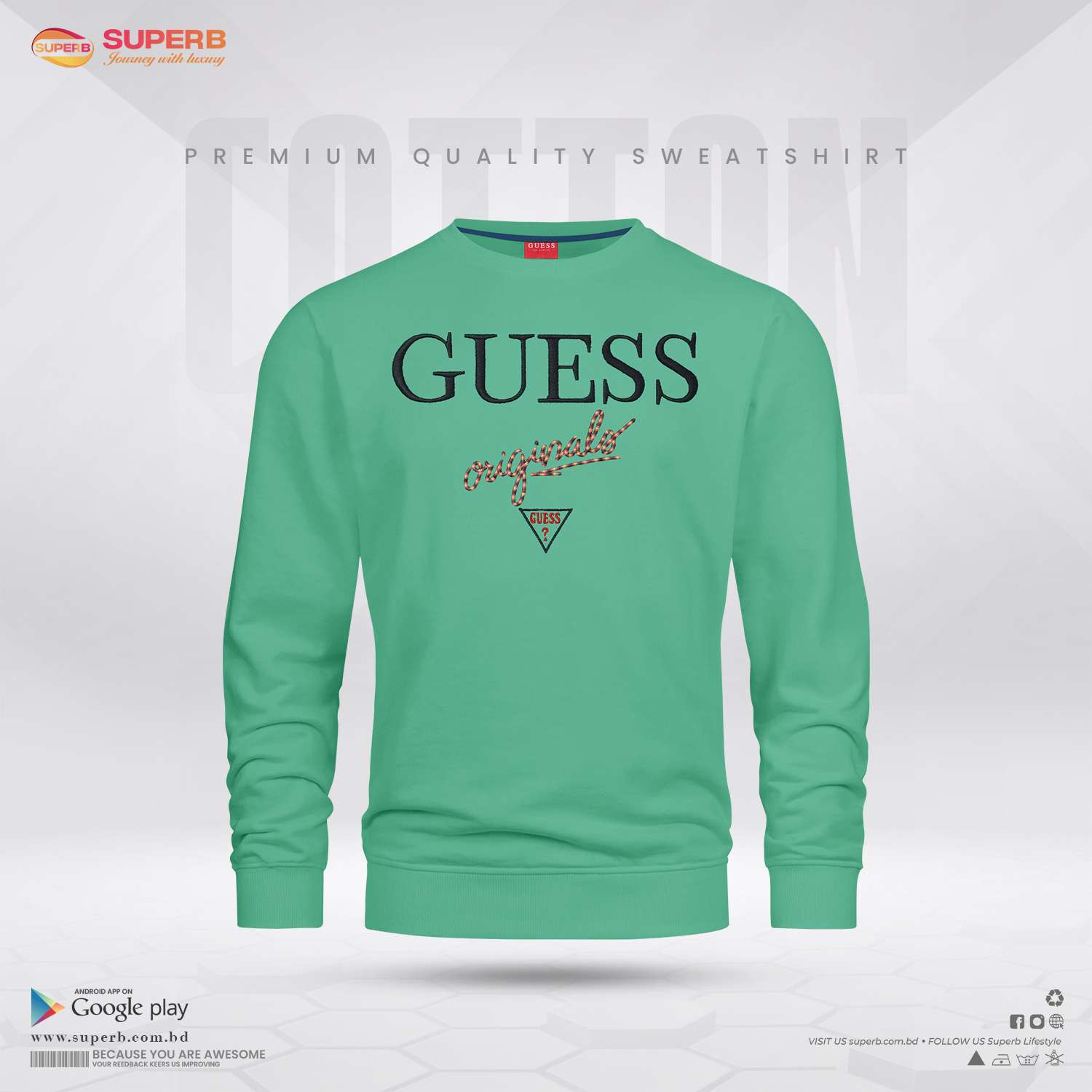 Short Description: Premium quality crew neck sweatshirt from Guess in an emerald green color featuring a prominent graphic logo with the brand name.