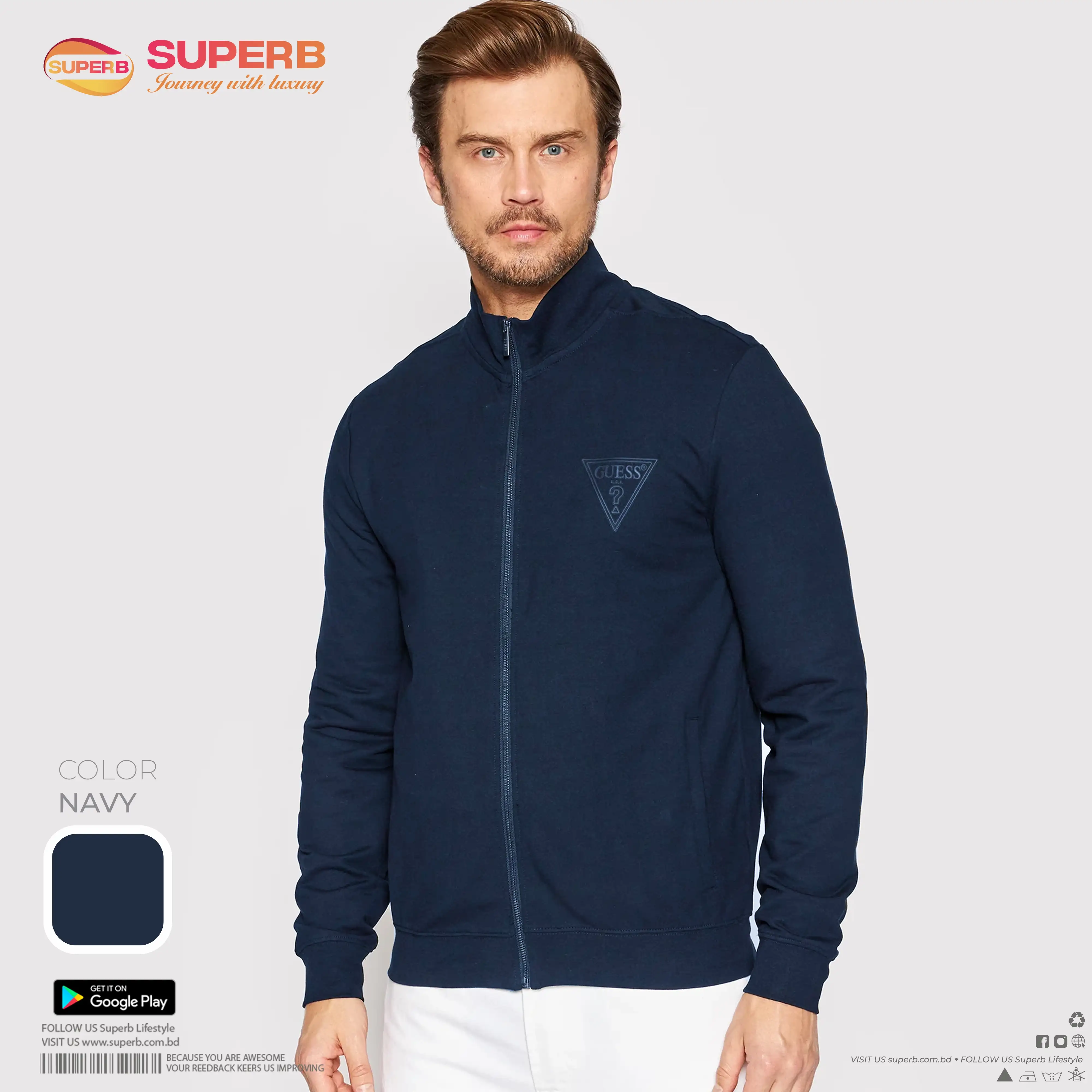 Short Description: Men's high neck sweatshirt from Guess in navy, featuring a zip-up closure, long sleeves, and front zip pockets with a matte finish.