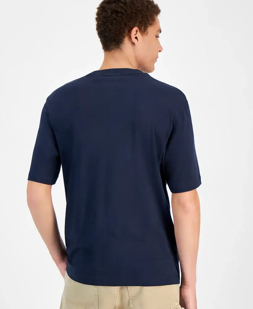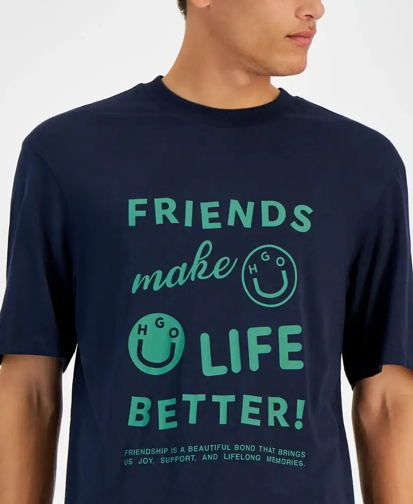 Short Description: Stylish Hugo Boss men's t-shirt in a dark blue hue featuring a vibrant "Friends Make Life Better" graphic with smiley face details.