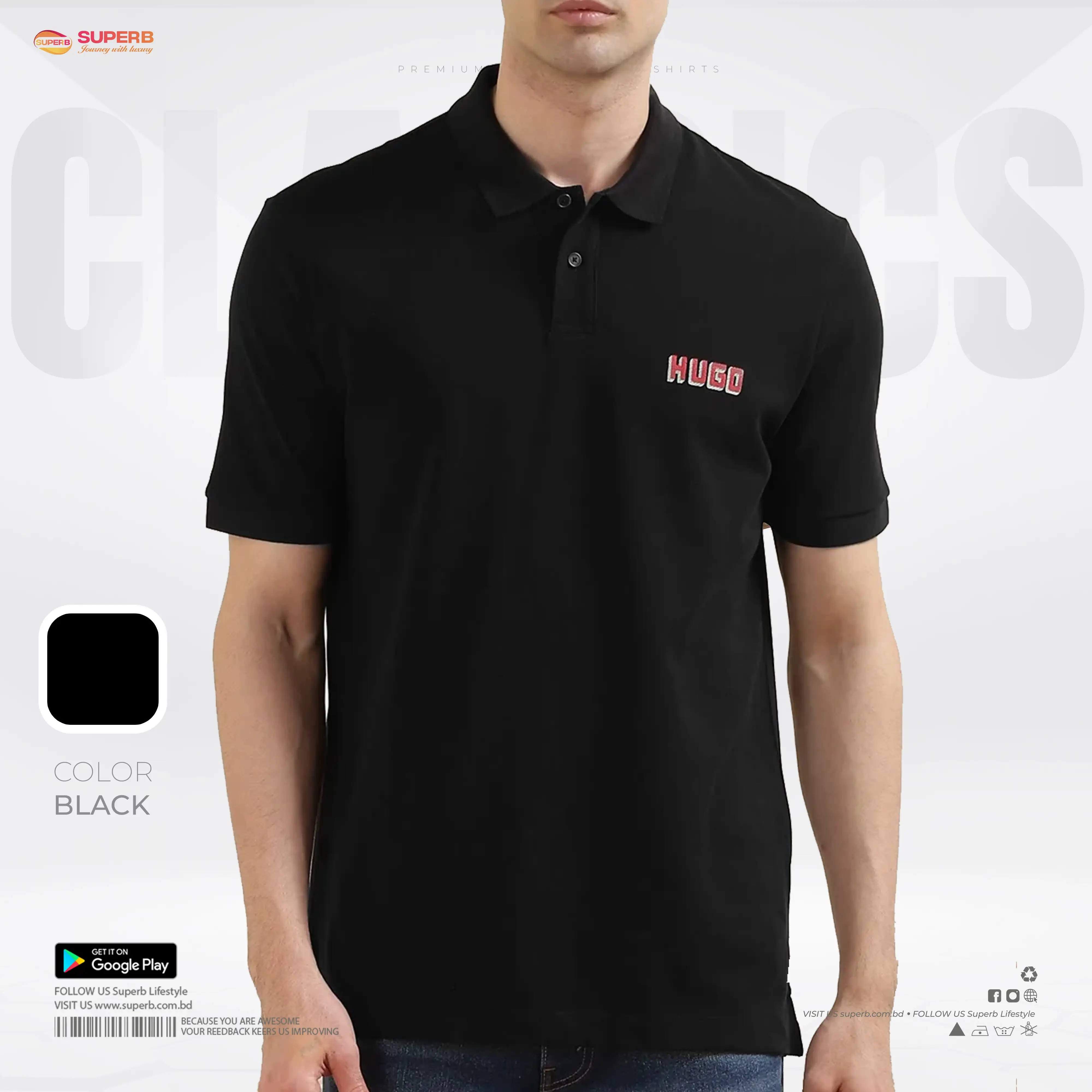 Short Description: Elevate your casual wardrobe with this stylish HUGO black polo t-shirt featuring an abstract chest print, crafted from breathable 100% cotton knit fabric with a classic polo collar and regular fit.