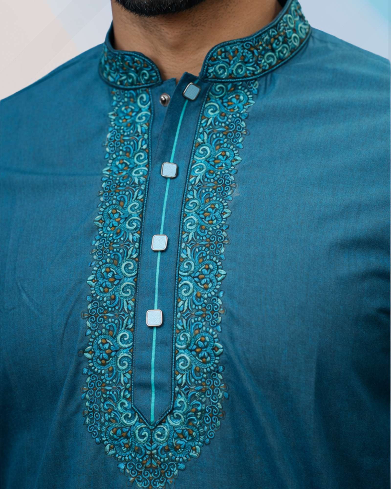 Short Description: Upgrade your traditional look with our Premium Indian Cotton Panjabi in elegant Petrol color. Crafted from high-quality breathable cotton with detailed embroidery on the placket, this Panjabi ensures comfort, style, and a refined festive appearance.