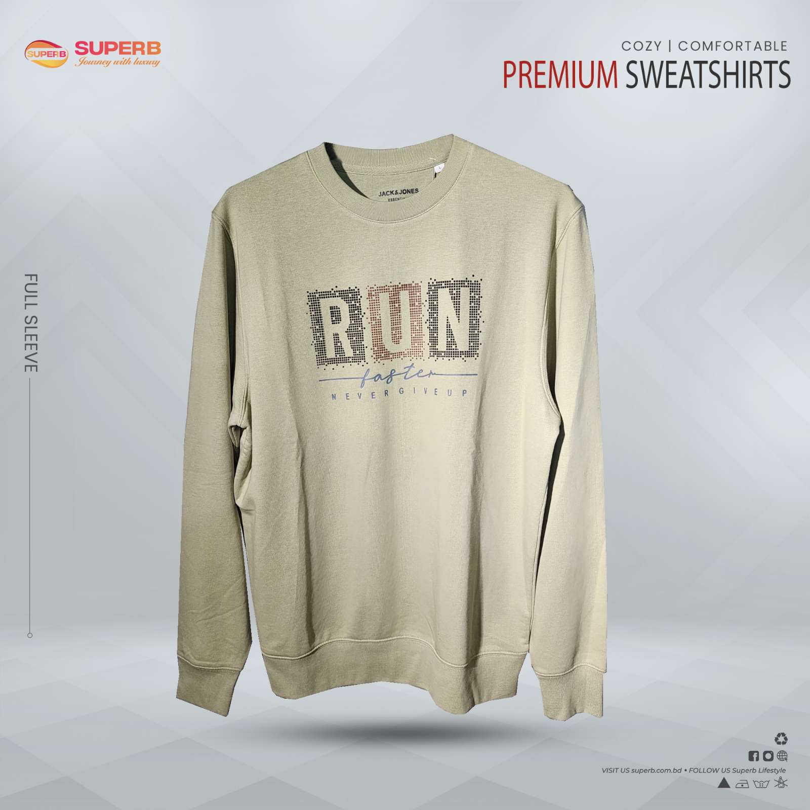 Short Description: Premium quality crew neck sweatshirt from JACK & JONES in a sage green color featuring a "RUN Faster NEVER GIVE UP" graphic.