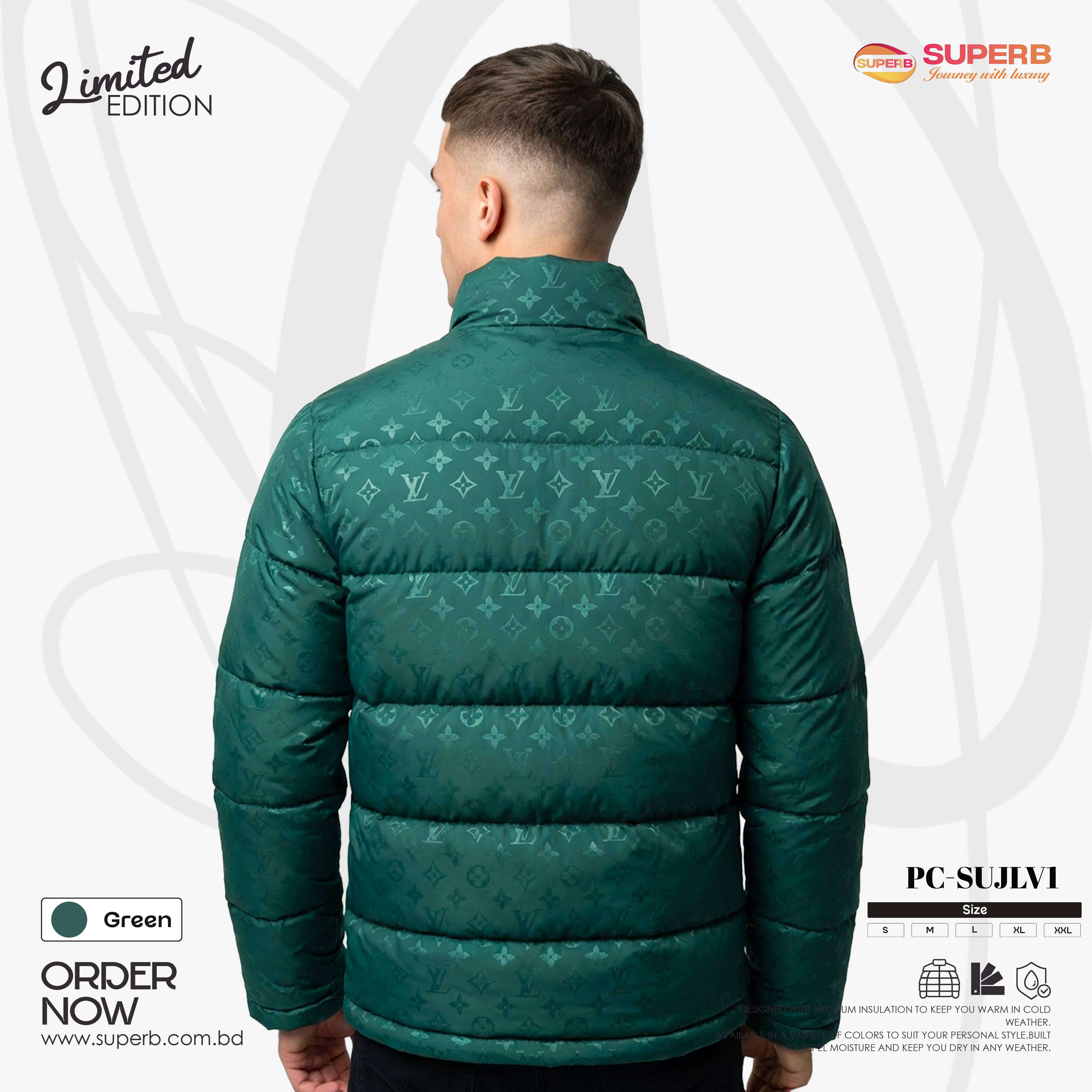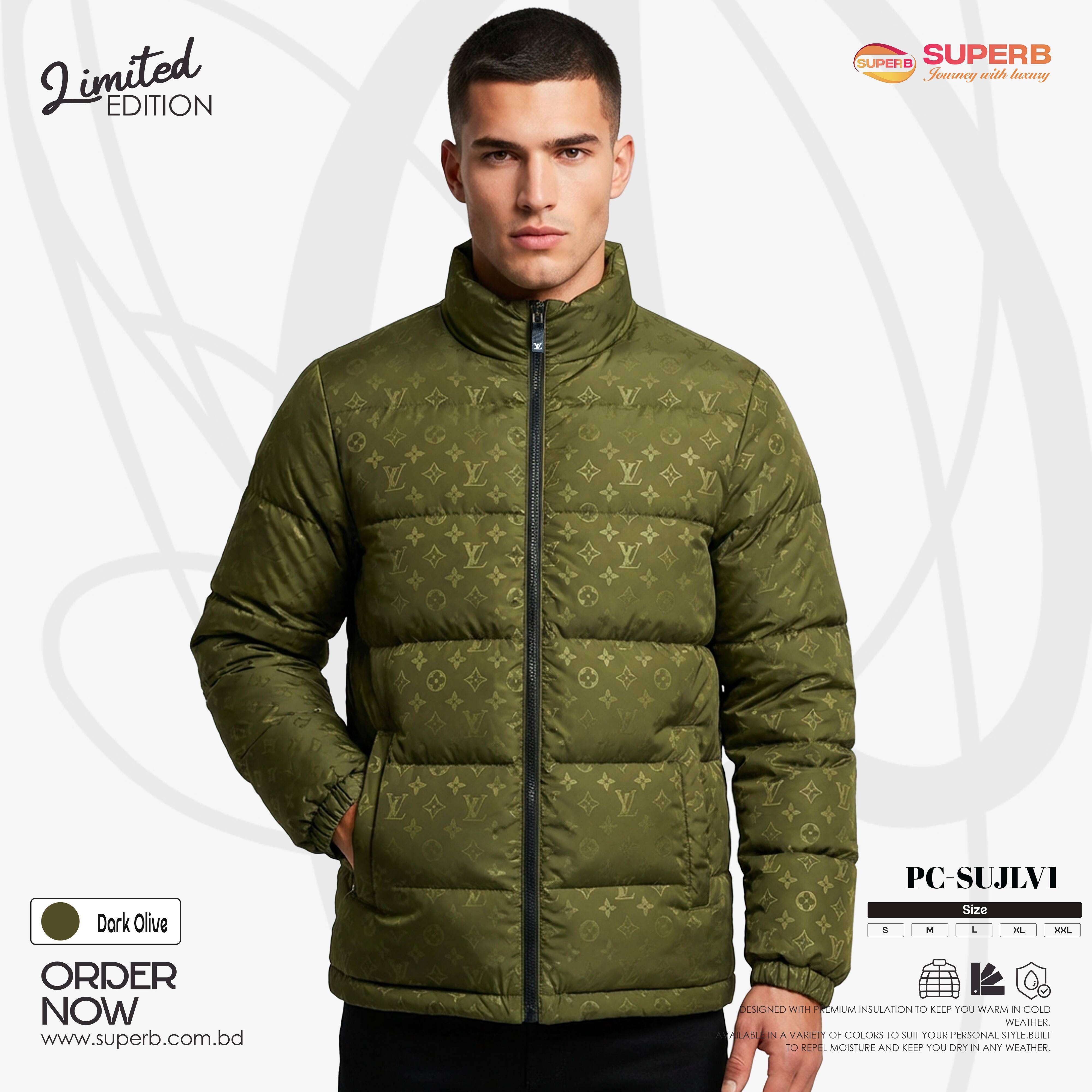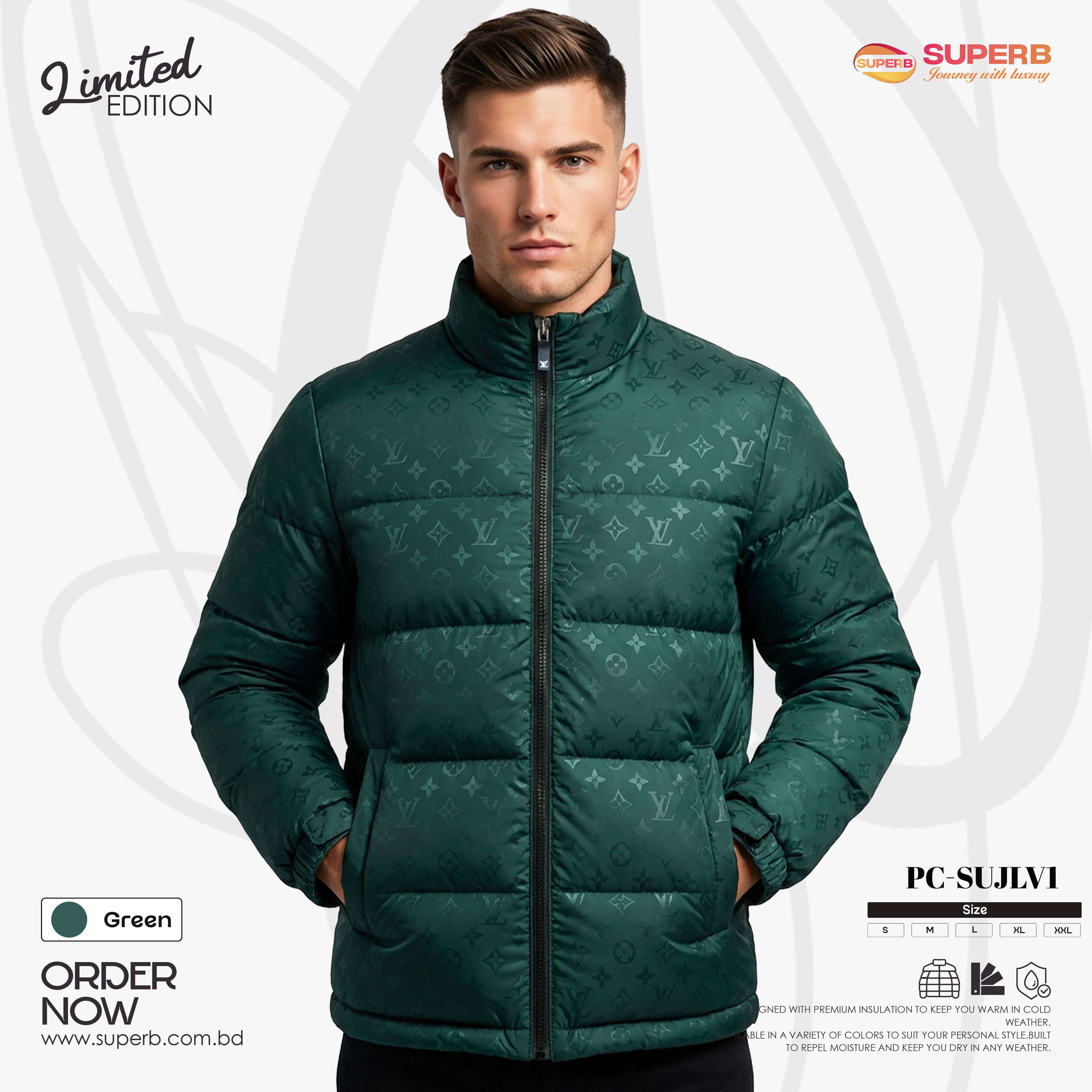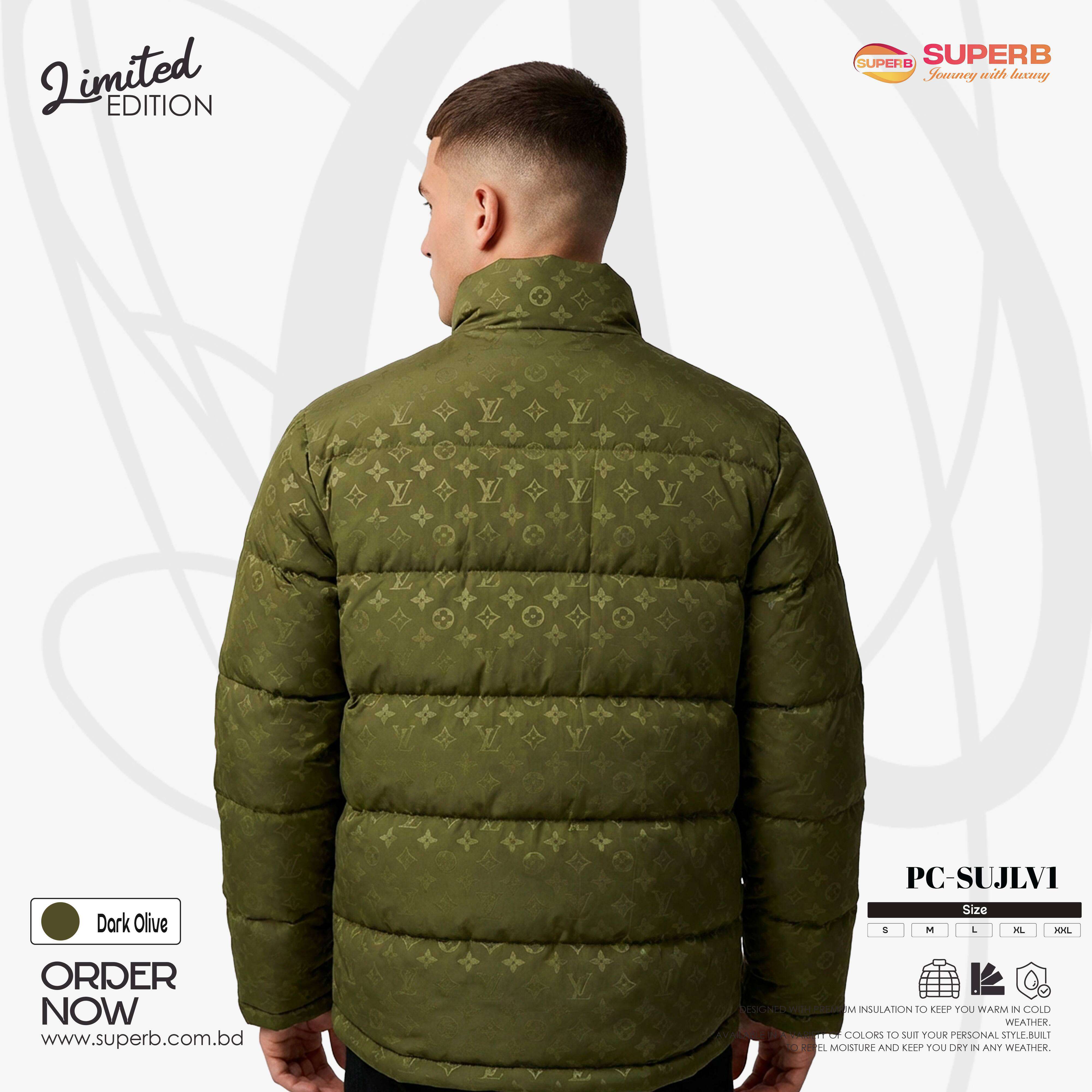 Short Description: Stay warm in luxury with this Louis Vuitton High Neck Padding Jacket, featuring an elegant all-over monogram print, premium insulation, and a modern high-neck design. Crafted for superior warmth, comfort, and statement winter style. Available in Dark Olive & Green colors.