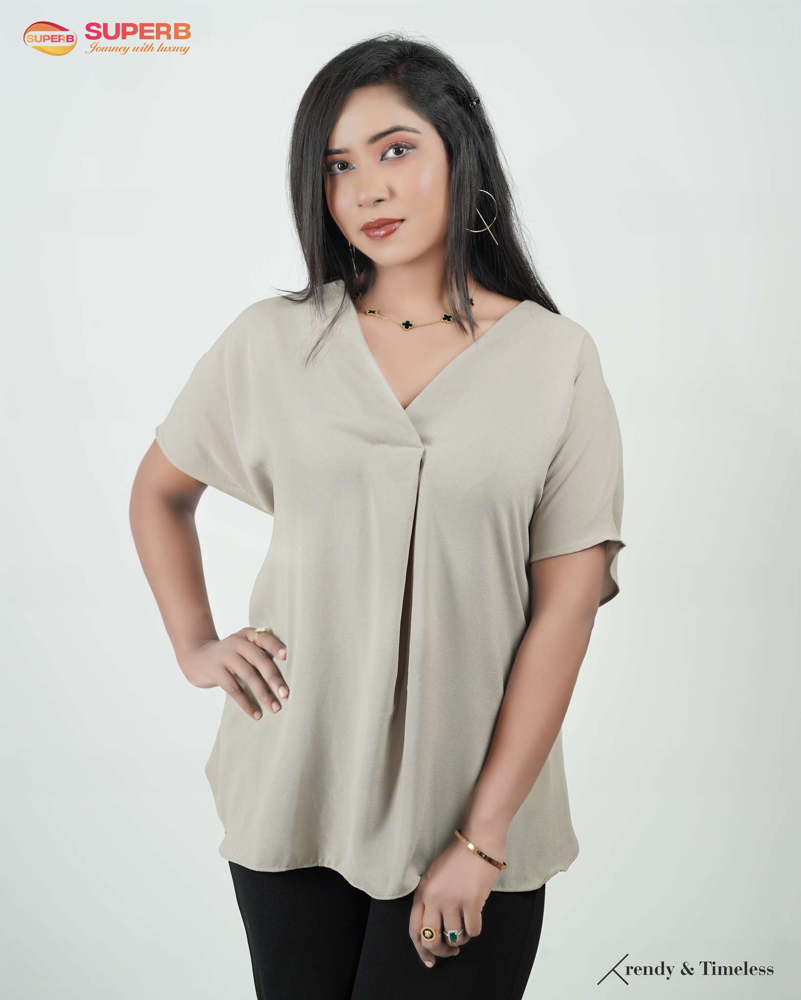 Crafted from a soft, flowing fabric (likely a knit or woven blend), this light beige top offers breathability and ease of movement, making it ideal for warm weather or layering under jackets and cardigans. The relaxed fit provides a comfortable yet polished look for everything from weekend outings to casual workdays.