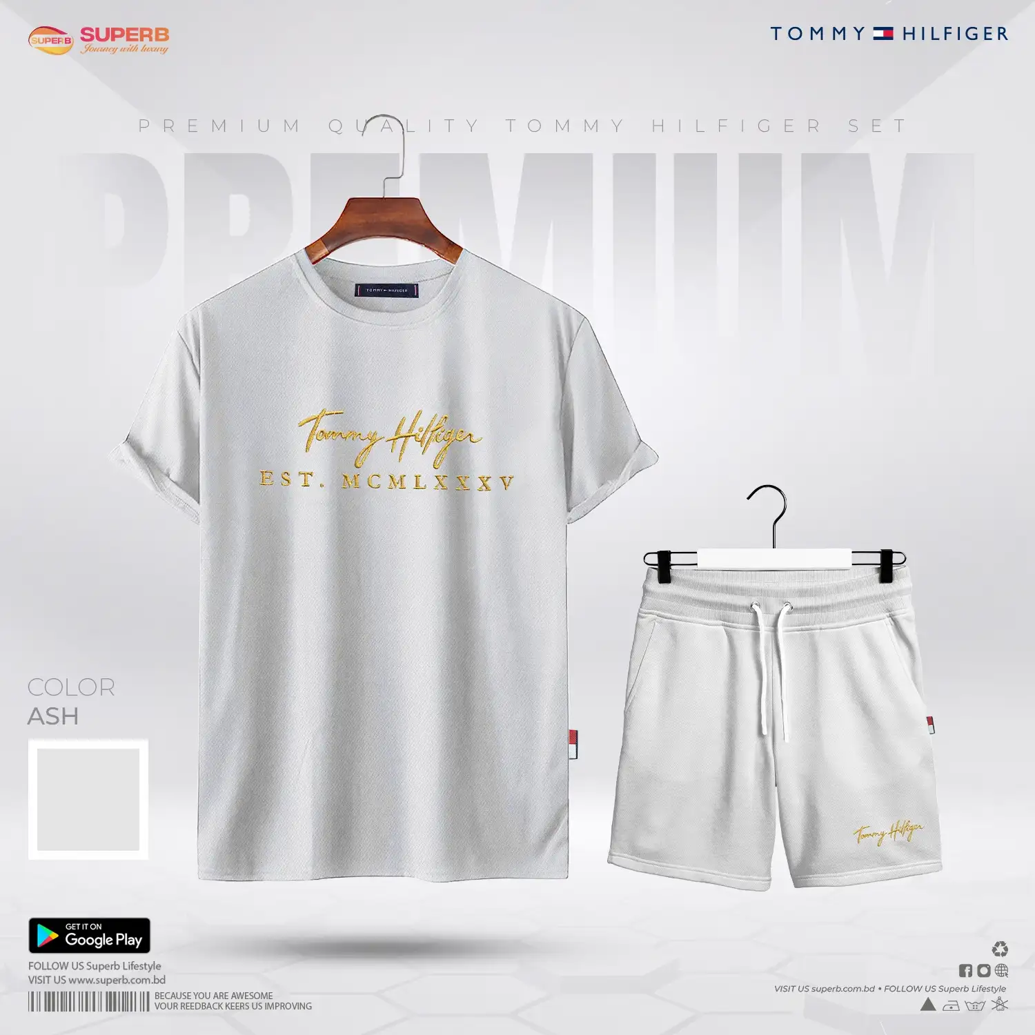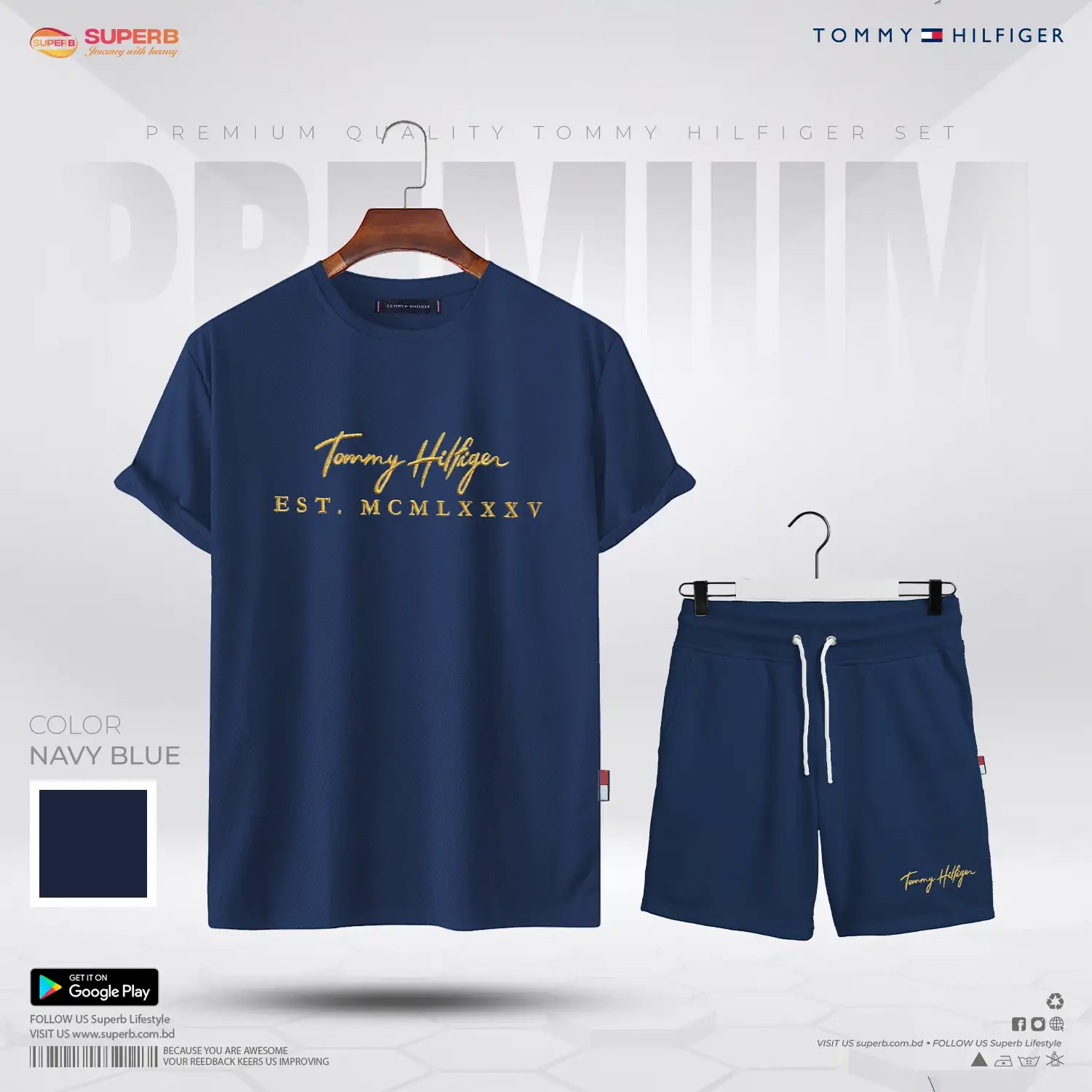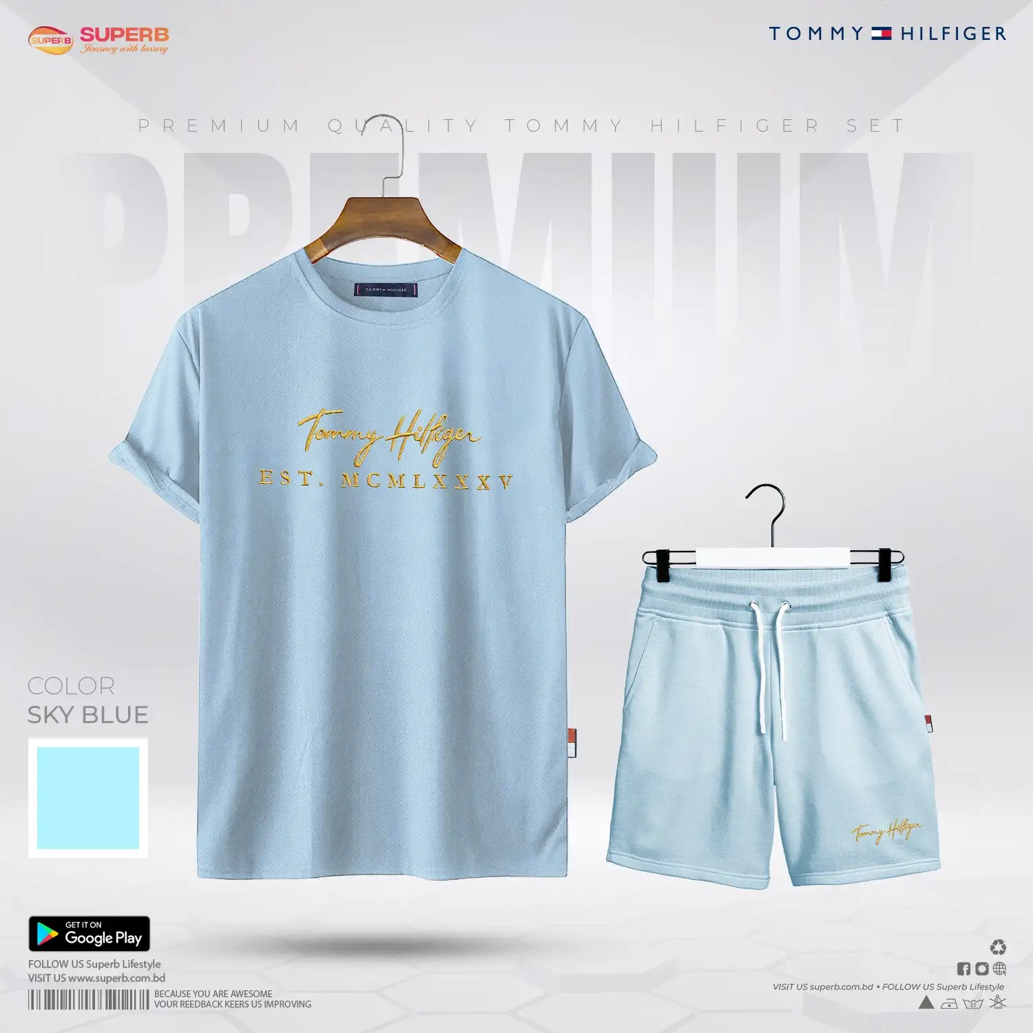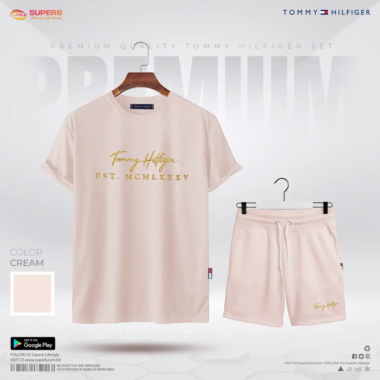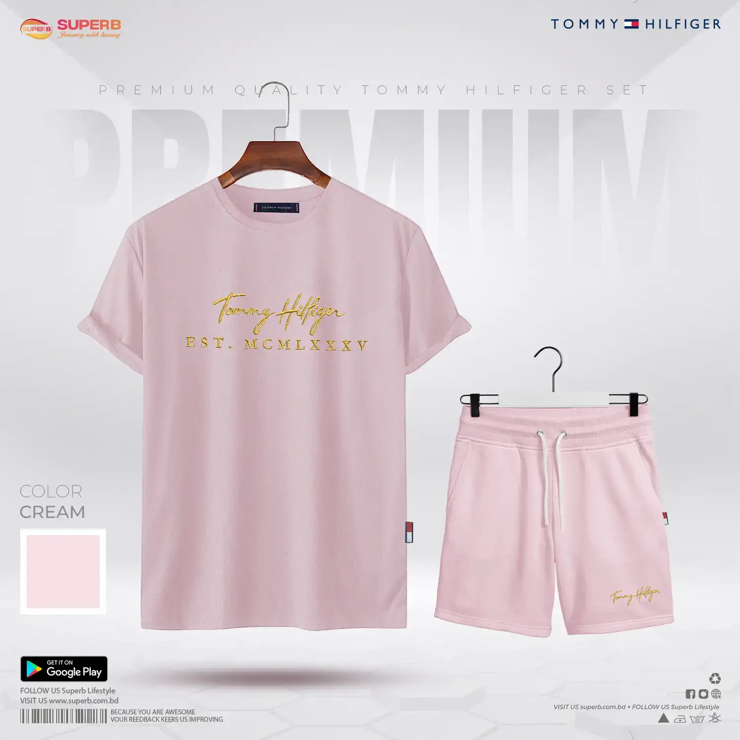 Short Description: High-quality Tommy Hilfiger set including a logo t-shirt and matching shorts for a stylish and comfortable casual look. Available Color -Navy Blue , Pink , Cream , Ash And Sky Blue.
