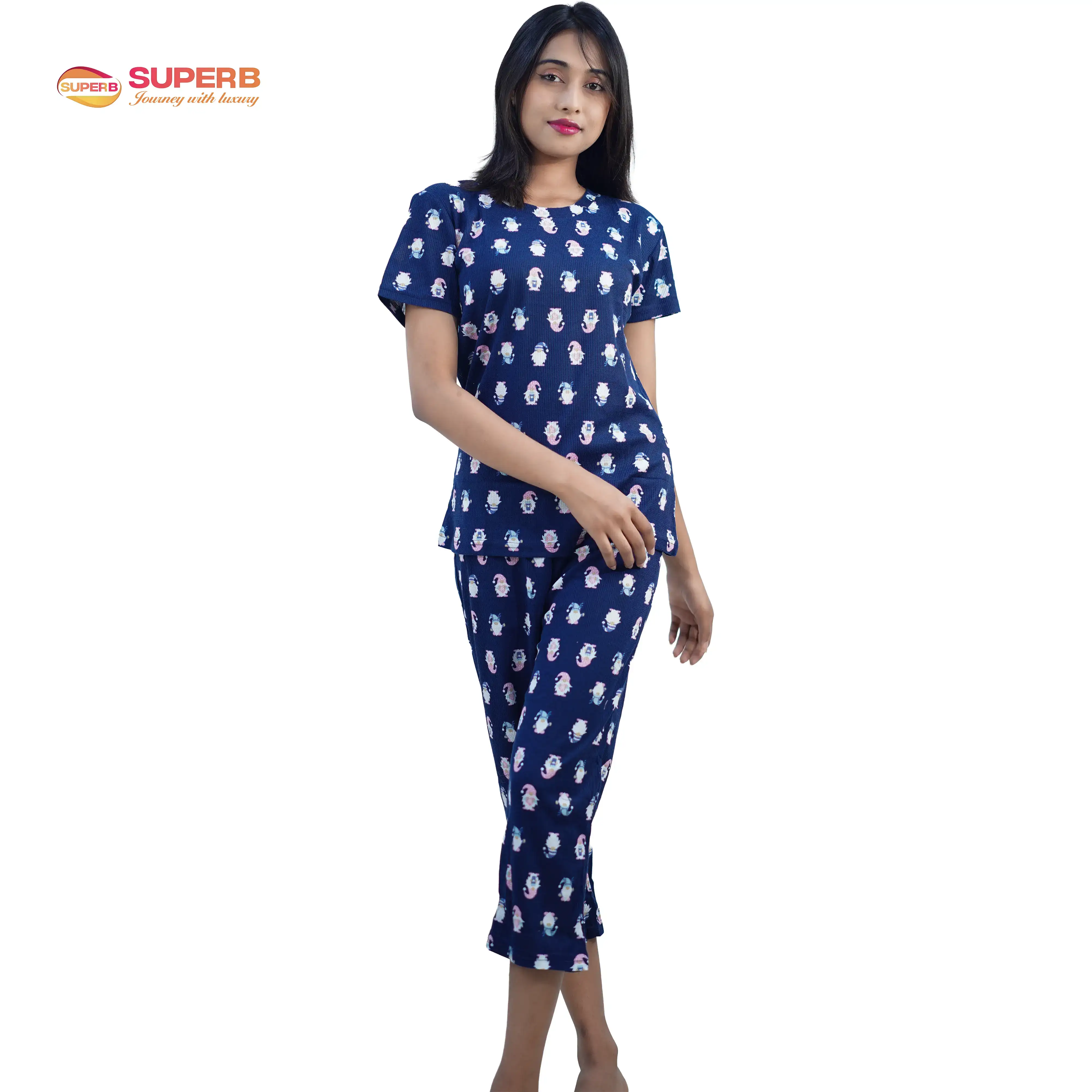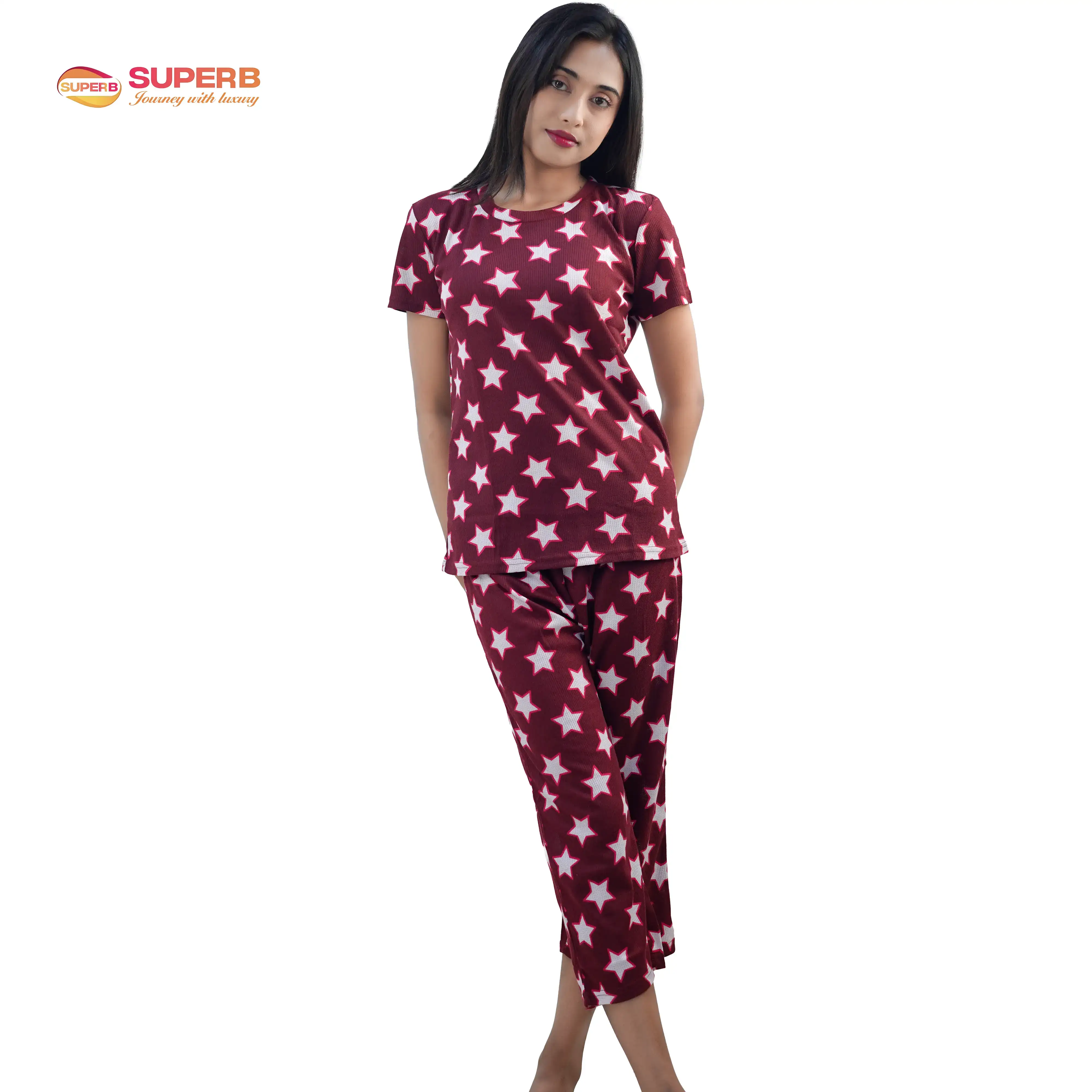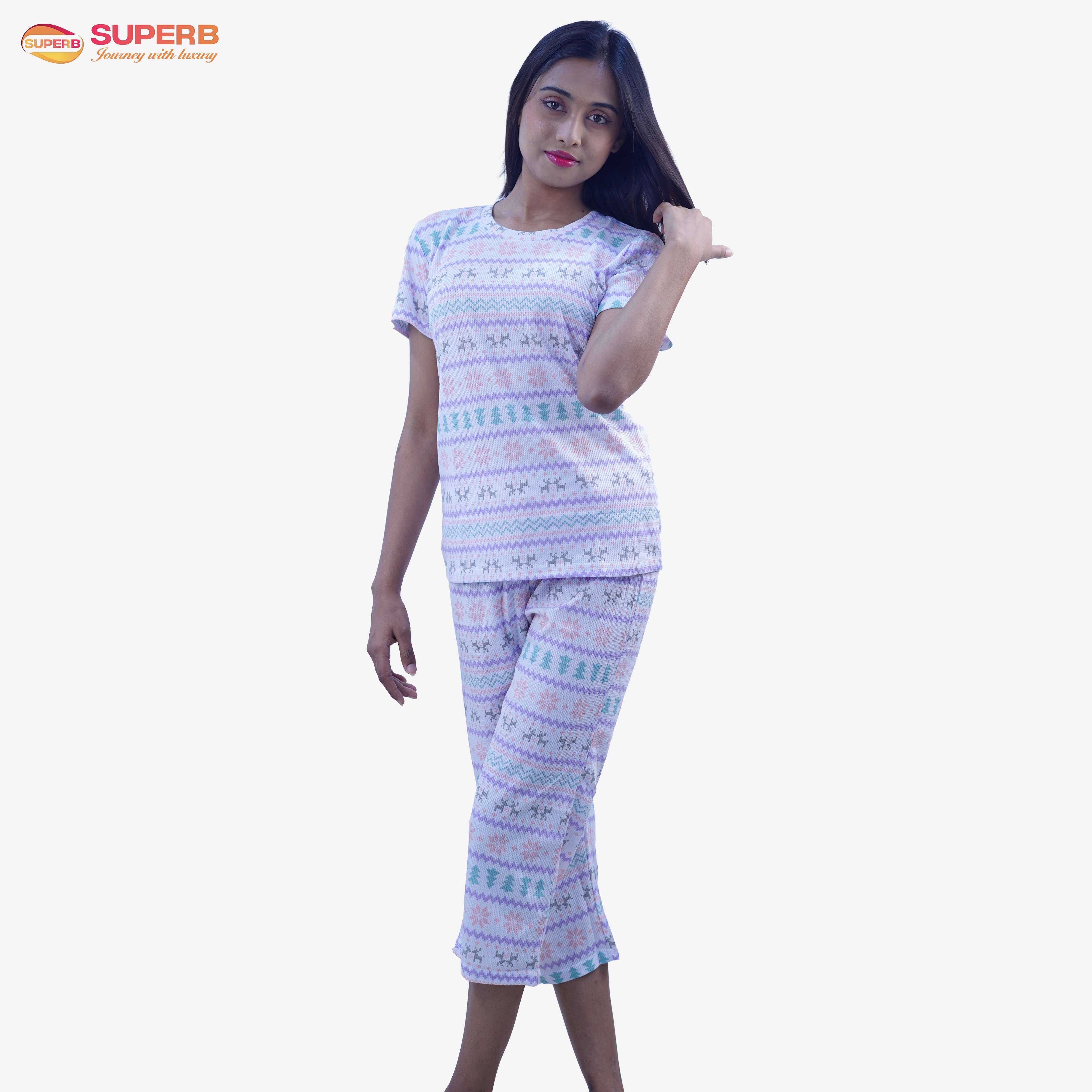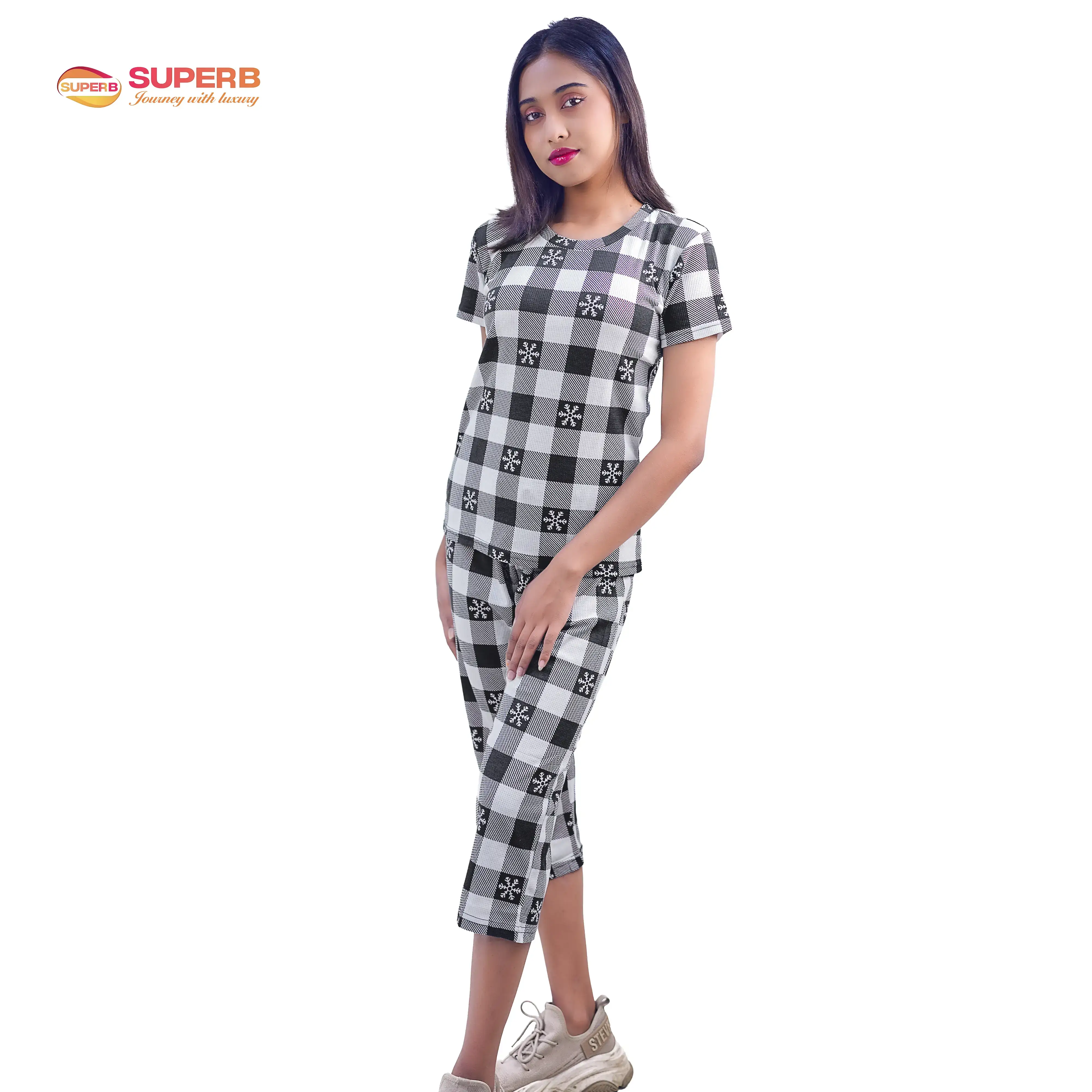 Short Description: Explore our women’s top & bottom set made from a soft cotton blend. This short-sleeve t-shirt and cropped pant combo offers breathability, flexibility, and stylish prints for everyday comfort.